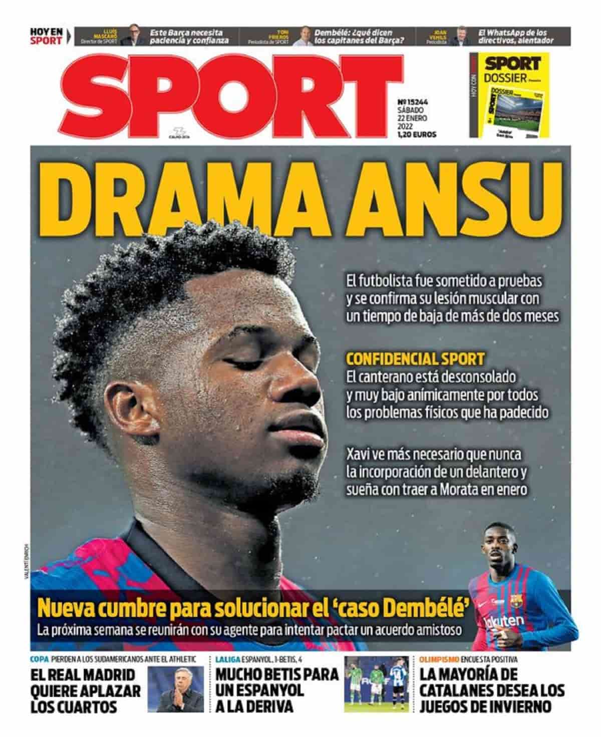 سلطت الصحف الرياضية العالمية اليوم السبت 22 يناير الضوء عن مباريات السبت في الدوريات الكبري، وعن إصابة أنسو فاتي لاعب، وآخر تطورات أزمة عثمان ديمبلي وتجديد عقده، وقرعة ربع نهائي كأس ملك إسبانيا واللقاء القوي الذي سيجمع ريال مدريد وأتلتيك بلباو، وأخبار سوق الانتقالات.