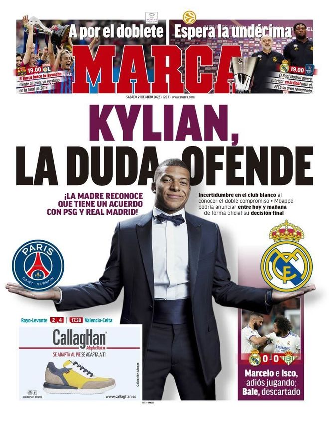 ونشرت الصحيفة الإسبانية عن مستقبل النجم الفرنسي كيليان مبابي بين البقاء في باريس سان جيرمان والرحيل لريال مدريد وكتبت: ”كيليان الشك يؤذي“، كما ركزت الصحيفة عن تعادل ريال مدريد سلبياً أمام ريال بيتيس في الجولة الأخيرة من الدوري الإسباني ووداع بعض لاعبيه وكتبت: ”مارسيلو وإيسكو الوداع في الملعب وجاريث بيل في المدرجات“.