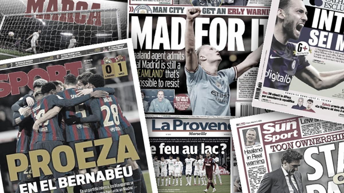 سلطت الصحف الرياضية العالمية اليوم الجمعة 3 مارس الضوء عن فوز برشلونة في ذهاب نصف نهائي كأس ملك إسبانيا على ريال مدريد، وقضية دفع برشلونة أموالا لنائب رئيس الحكام نجريرا، وتصريحات وكيلة أعمال إيرلينج هالاند مهاجم مانشستر سيتي حول انتقاله إلى ريال مدريد في المستقبل.