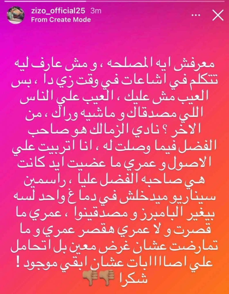 وكان قد صرح “مصطفى يونس” لاعب الأهلي الأسبق بأن والد زيزو عقد جلسة مع مسؤولي الأهلي واتفقوا على كافة الأمور الخاصة بانتقال اللاعب إلى قلعة الجزيرة ونشر زيزو عبر يومياته بـ “انستجرام” قائلاً: “معرفش ايه المصلحة ومش عارف ليه تتكلم في إشاعات في وقت زي دا بس العيب مش عليك العيب على الناس اللي مصدقاك وماشيه وراك”.