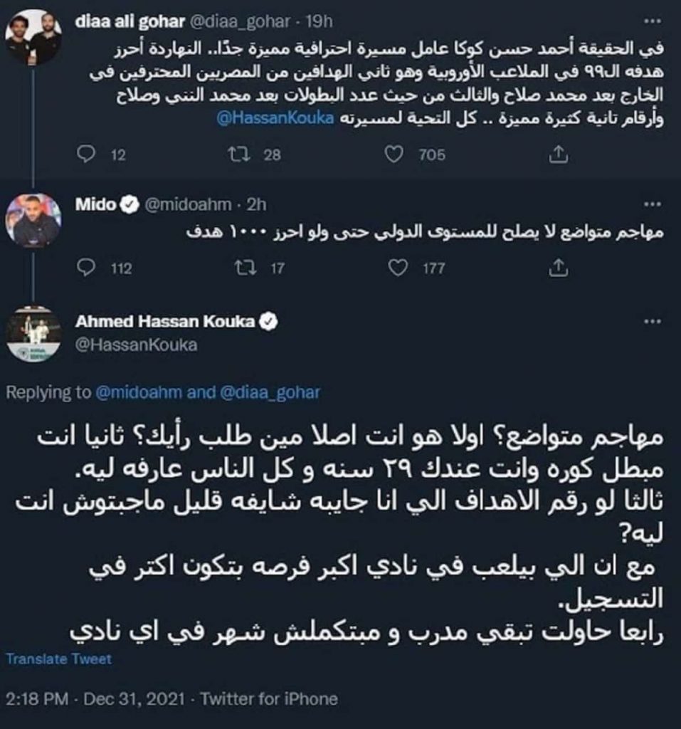 وقد علق أحمد كوكا على تغريدة لأحد الصحفيين المصريين عبر موقع “تويتر” تحدث خلالها عن مسيرة أحمد حسن كوكا الإحترافية المميزة بعد إحرازه 99 هدف في مسيرته بأوروبا والتي تجعله يأتي في المرتبة الثالثة بعد محمد النني ومحمد صلاح حيث رد ميدو على نفس التغريدة قائلاً: ” مهاجم متواضع لا يصلح للمستوى الدولي حتى ولو أحرز 1000 هدف”.