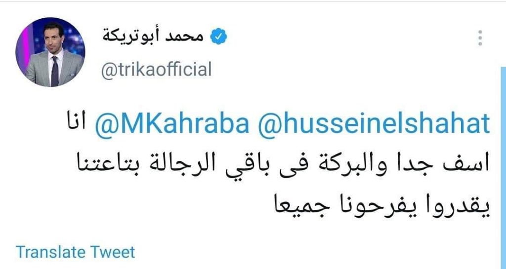 أعتذر محمد أبو تريكة أسطورة الأهلي والكرة المصرية عن تسببه في إيقاف (حسين الشحات ومحمود كهربا) ثنائي المارد الأحمر بعد قرار فيفا بحرمانهما من المشاركة في مباراة بالميراس البرازيلي بمونديال الأندية.