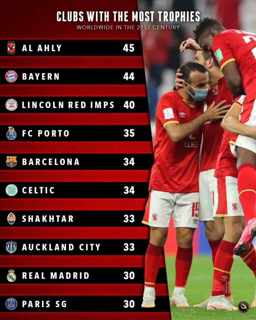 ونشر موقع “Globe Soccer” العالمي قائمة الأندية الأكثر تتويجًا بالبطولات في القرن الـ21 على مستوى العالمي لتأتي المفاجأة الأكبر بالنسبة للجماهير المصرية والعربية بشكل عام العملاق القاهري جاء في المركز الأول بـ45 لقب متفوق على بايرن ميونيخ بالمركز الثاني وبرشلونة الذي جاء في المركز الخامس.