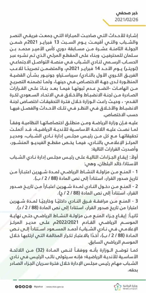 حيث قررت وزارة الرياضة في المملكة العربية السعودية منع خالد البلطان رئيس نادي الشباب من مزاولة النشاط الرياضي ومنعه من دخول النادي وعدم مرافقته فرق النادي داخلياً وخارجيًا لمدة شهرين وسيتم إيقاع جزاء المنع من مزاولة النشاط الرياضي حتى نهاية الموسم الرياضي القادم 2021/2022م على مدير المركز الإعلامي في نادي الشباب أحمد المسعود أخدذاً بالاعتبار تكرار المخالفة التي ارتكبها خلال الموسم الرياضي السابق.