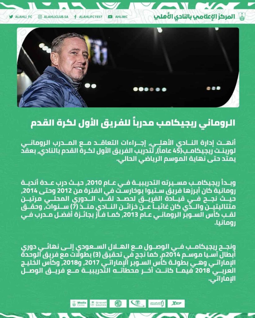 أعلن مجلس إدارة نادي الأهلي السعودي برئاسة “عبدالإله مؤمنة” رسمياً عن التعاقد مع الروماني “لورينت ريجيكامب” لخلافة المدير الفني الصربي فلادان ميلويفيتش الذي تمت إقالته.