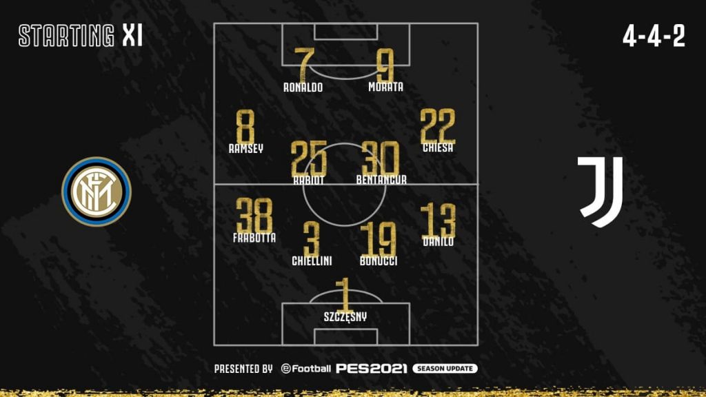 أعلن الثنائي أنطونيو كونتى وأندريا بيرلو المديران الفنيان لفريقى إنتر ميلان ويوفنتوس، عن التشكيل الأساسي لمواجهة ديربى إيطاليا والتي ستنطلق في تمام الساعة 10:45 مساءً بتوقيت السعودية في إطار لقاءات الجولة رقم 18 من عمر مسابقة الدوري الإيطالي.