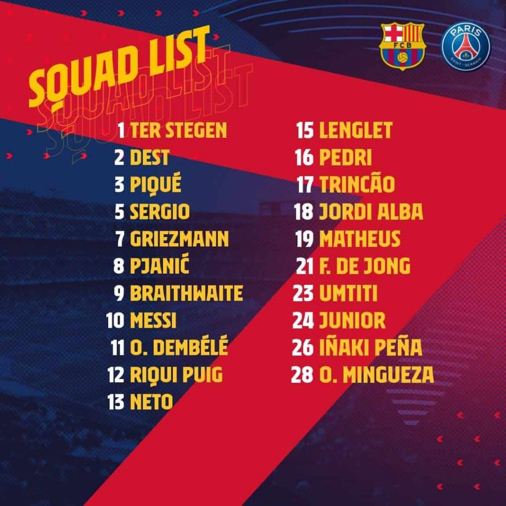أعلن نادي برشلونة عبر موقعه الرسمي عن قائمة الفريق التي اختارها المدرب “رونالد كومان” لخوض مباراة باريس سان جيرمان والتي ستقام مساء الليله الثلاثاء في الساعة 11:00 مساء بتوقيت مكة على ملعب “الكامب نو” في ذهاب دور 16 من بطولة دوري أبطال أوروبا.