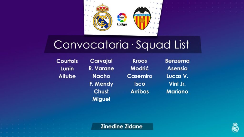 أعلن المدرب الفرنسي “زين الدين زيدان” عن قائمة فريق ريال مدريد لمواجهة فالنسيا التي ستقام غداً الأحد 14 فبراير على ملعب “ألفريدو دي ستيفانو” ضمن منافسات الجولة 23 من بطولة الدوري الإسباني.