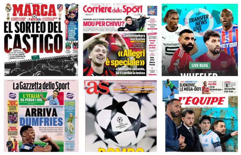 • قرعة العقاب: وصفت الصحيفة القرعة بهذا الاسم نظراً للمسار الصعب، حيث قد يواجه ريال مدريد بنفيكا أو بودو، بينما ينتظر أتلتيكو مدريد مواجهة محتملة ضد غلطة سراي أو بروج.