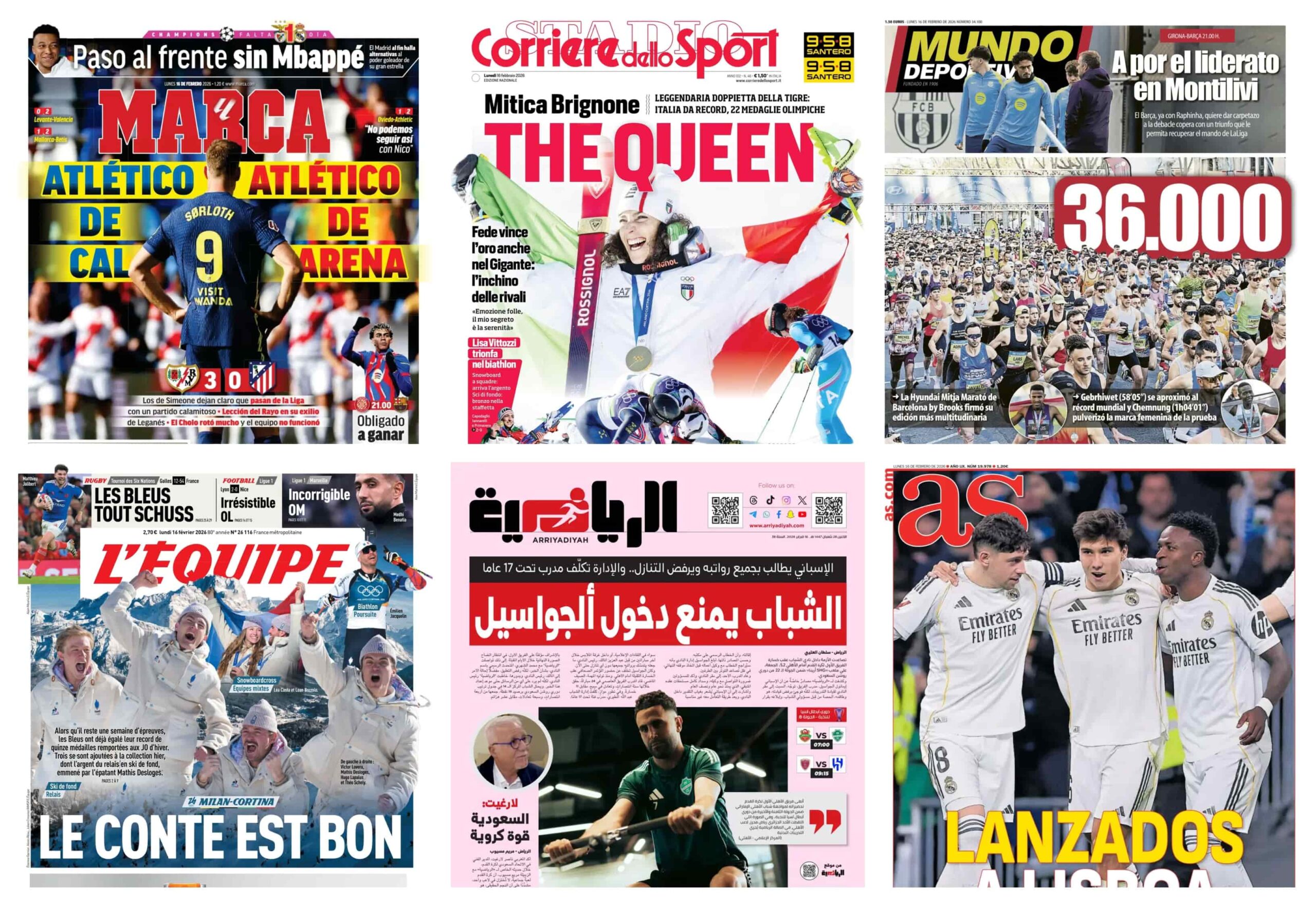 سيطرت الإنجازات التاريخية في الألعاب الأولمبية الشتوية على أغلفة الصحف الأوروبية الصادرة اليوم الاثنين 16 فبراير 2026 جنباً إلى جنب مع اشتعال المنافسة في الدوريات الكبرى، وبينما احتفلت إيطاليا بأساطيرها في التزلج، كانت الملاعب الإسبانية تشهد تراجعاً كبيراً لأتلتيكو مدريد وصراعاً شرساً على صدارة الليغا، في حين تناولت الصحافة السعودية تطورات إدارية وفنية هامة في أندية دوري روشن والاتحاد السعودي لكرة القدم.