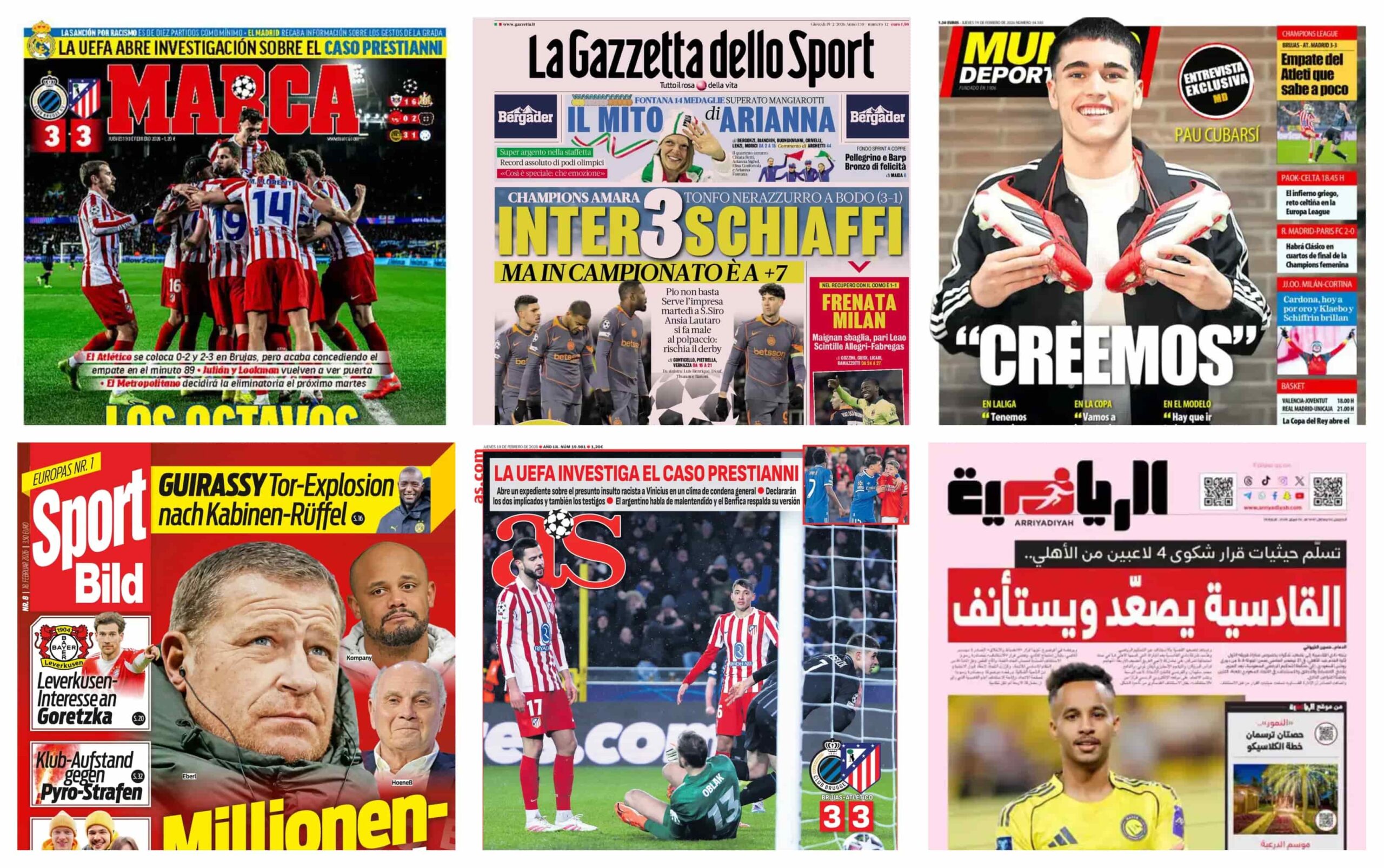 شهدت الصحف الرياضية العالمية الصادرة صباح اليوم الخميس 19 فبراير 2026 مجموعة من الأحداث الدراماتيكية، تنوعت ما بين تعثرات غير متوقعة لمتصدري الدوريات الكبرى، واشتعال فتيل المنافسات القارية في دوري أبطال أوروبا وآسيا، بالإضافة إلى تطورات قانونية وإدارية داخل أروقة الأندية الكبرى.
