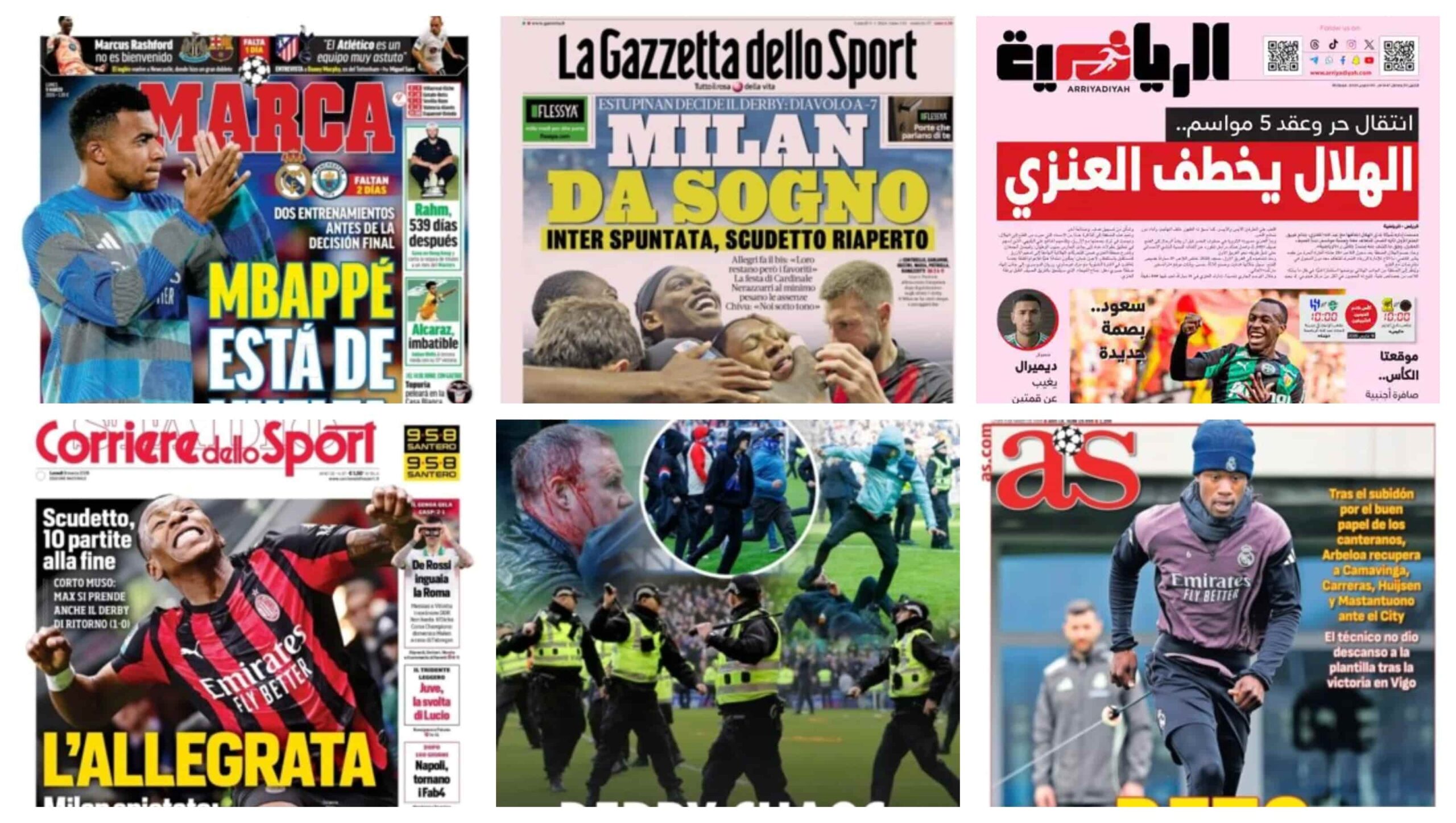 شهدت أغلفة الصحف الرياضية العالمية فوز  ميلان بديربي الغضب لصالحه، مما أعاد إشعال الصراع على لقب الدوري الإيطالي، بينما تترقب الجماهير المدريدية عودة نجمها الأول كيليان مبابي لمواجهة مانشستر سيتي، وفي كتالونيا تتجه الأنظار نحو المناظرة الرئاسية الأولى، في حين سجل النجم السعودي سعود عبد الحميد حضوراً تاريخياً في الملاعب الفرنسية.