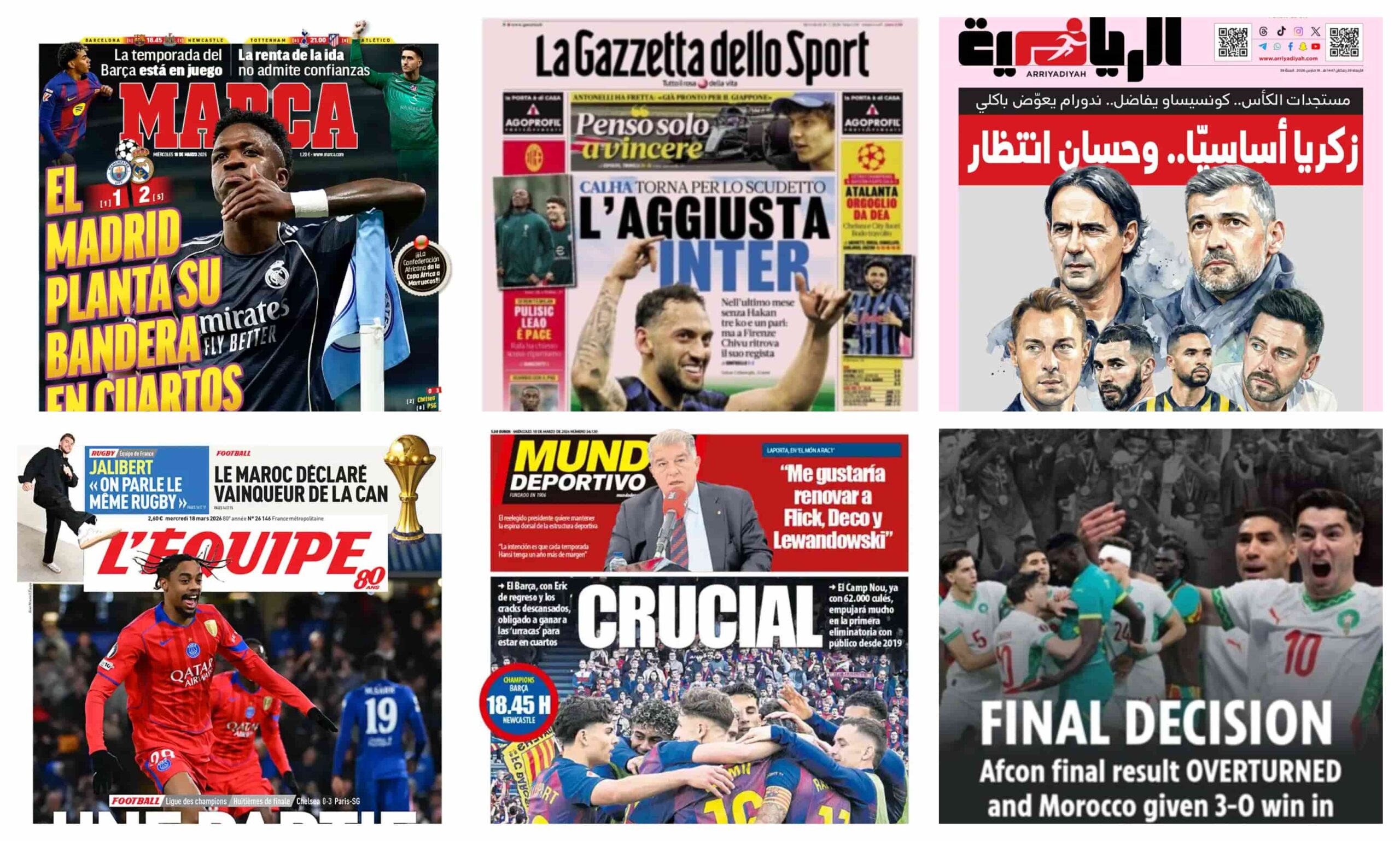 نشرت أغلفة الصحف العالمية اليوم الأربعاء 18 مارس عن ليلة دوري أبطال أوروبا والتي شهدت أحداثاً دراماتيكية، حيث نجح ريال مدريد في تأكيد عقدته لمانشستر سيتي وإقصائه من البطولة، ليضرب موعداً كلاسيكياً مع بايرن ميونخ في ربع النهائي، وفي القارة السمراء فجّر الاتحاد الأفريقي مفاجأة من العيار الثقيل بسحب اللقب من السنغال ومنحه للمغرب بقرار إداري، بينما تترقب الجماهير السعودية صدامات كبرى في نصف نهائي كأس خادم الحرمين الشريفين.