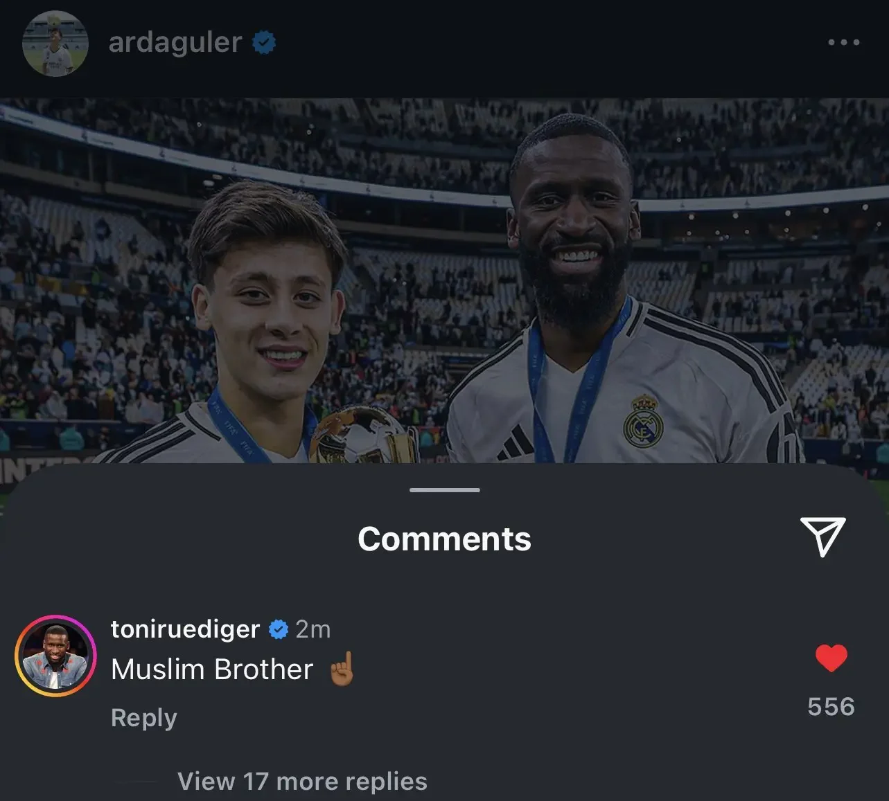 وبعد المباراة قام أردا جولر بنشر صور للإحتفال بالكأس وعلق عليها قائلاً: “أفضل نادي في العالم”، ليُفاجئه روديجر بالتعليق قائلاً: “أخي المسلم”، ويشتهر كلا من جولر وروديجر باحتفالاتهم التي تحمل طابعًا إسلاميًا بالسجود أو التوكل، حيث يرفع النجم التركي دائماً يده نحو السماء علامةً للتوكل على الله.