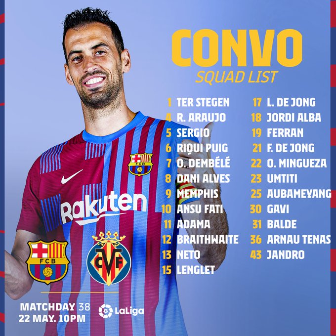 أعلن نادي برشلونة عن قائمة الفريق التي أختارها المدرب الإسباني “تشافي هيرناندز” لخوض مباراته أمام فياريال والتي ستقام غداً الأحد 22 مايو في الساعة 11:00 مساءً بتوقيت مكة ضمن منافسات الجولة 38 والأخيرة من الدوري الإسباني.