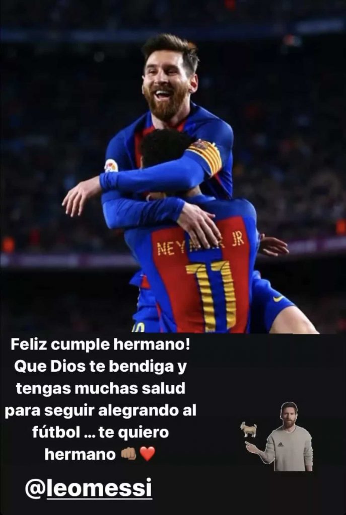 ونشر نيمار عبر حسابه الشخصي بـ “تويتر” صورة له بقميص برشلونة وهو يحمل ميسي خلال الإحتفال بأحد الاهداف وعلق قائلاً “عيد ميلاد سعيد يا أخي!” كما نشر نيمار عبر حسابه بـ “إنستجرام” صورة له بقميص برشلونة أثناء حمل صديقه ميسي وكتب عليها “بارك الله فيك ومنحك صحة جيدة لتستمر في إسعاد كرة القدم.. أحبك أخي”.