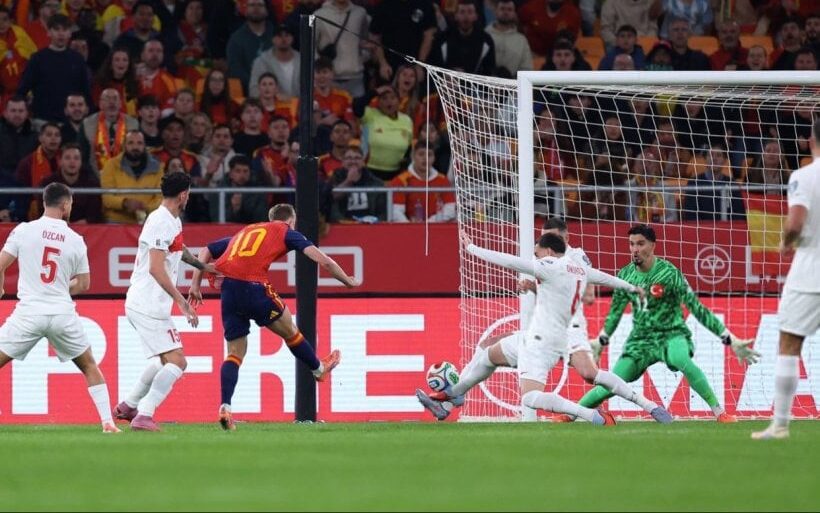 وشهدت المباراة إثارة كبيرة وتقلبات في النتيجة، حيث سعت إسبانيا لحسم الأمور مبكراً، لكن عزيمة المنتخب التركي وضعت بطل أوروبا السابق في موقف صعب، وقد افتتح المنتخب الإسباني التسجيل مبكراً عبر نجمه داني أولمو في الدقيقة الرابعة من بداية اللقاء، معطياً الأفضلية لـ “اللاروخا”.