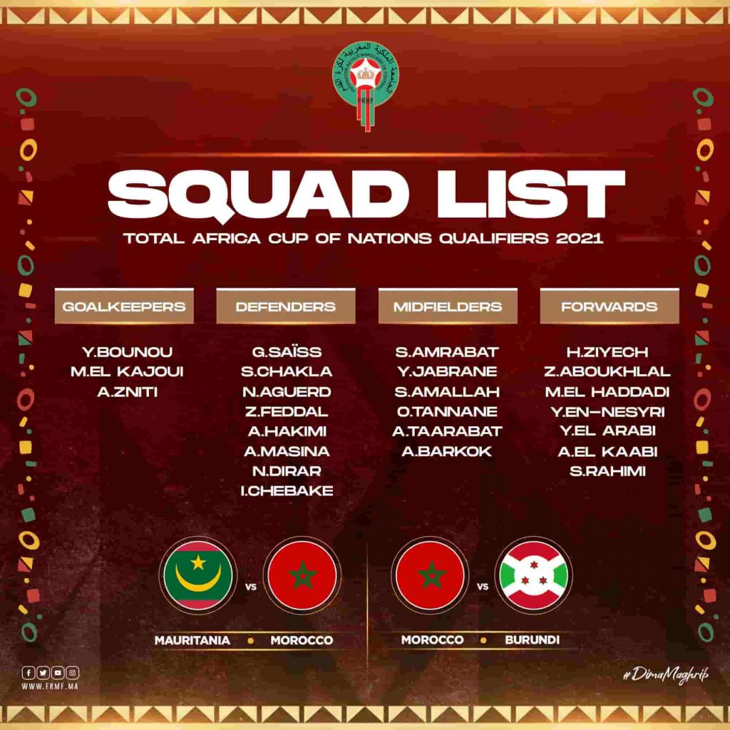وشهدت القائمة استبعاد بدر بانون لاعب الأهلي رغم سفر اللاعب منذ يومين للانضمام لصفوف منتخب بلده عقب مباراته مع الأهلي ضد فيتا كلوب في دوري أبطال إفريقيا وتواجد حكيم زياش لاعب تشيلسي وياسين بونو حارس مرمى إشبيلية وأشرف حكيمي لاعب إنتر ميلان ويخوض منتخب المغرب مواجهتين أمام موريتانيا وبوروندي ويتصدر المنتخب المغربي المجموعة الخامسة برصيد 10 نقاط.