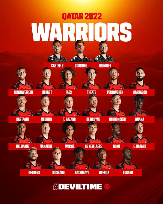 وشهدت القائمة إستدعاء هازارد كما تواجد تيبو كورتوا حارس ريال مدريد، بالإضافة إلى كيفين دي بروين وأيضاً وجود روميلو لوكاكو، نجم الإنتر، ويقع منتخب بلجيكا في المجموعة السادسة رفقة منتخبات كرواتيا والمغرب وكندا، ويفتتح منتخب بلجيكا مبارياته أمام كندا يوم الأربعاء 23 نوفمبر الجاري.