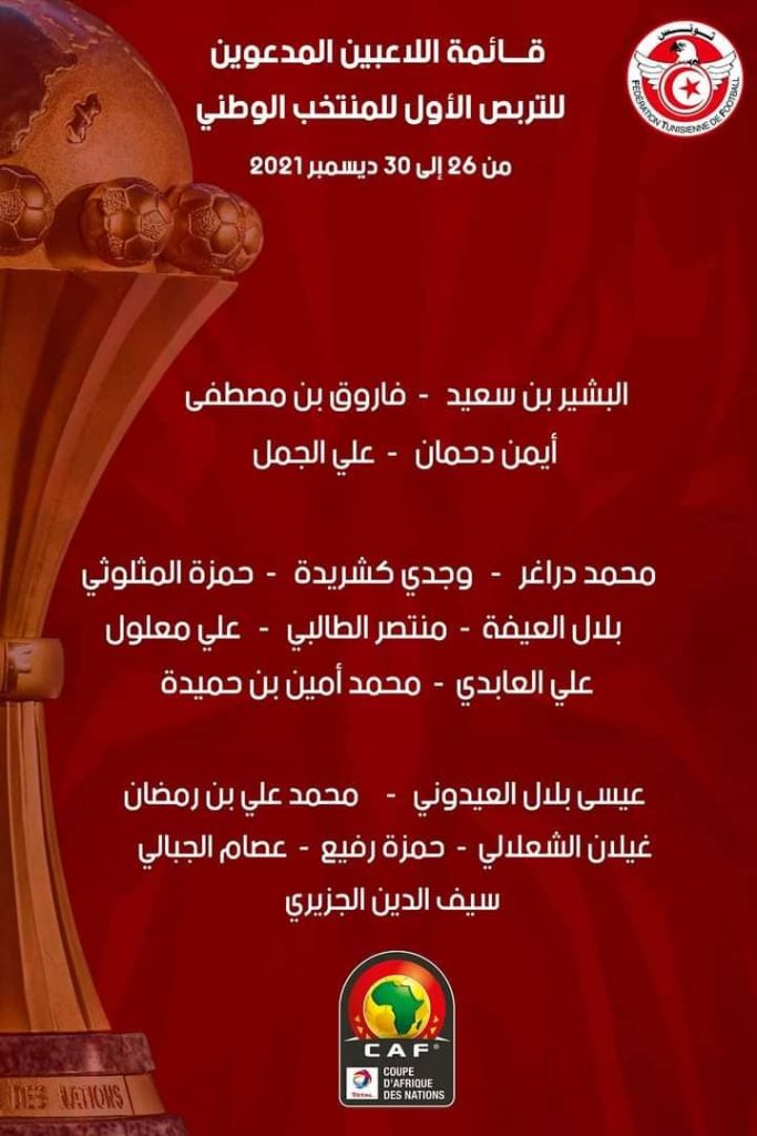 وجاءت قائمة منتخب تونس بإستبعاد فرجاني ساسي لاعب الدحيل القطري كما تم إستبعاد فخر الدين بن يوسف وتواجد علي معلول ظهير أيسر الأهلي وحمزة المثلوثي وسيف الدين الجزيري لاعبي الزمالك لبداية معسكر الأعداد يوم 26 ويستمر حتى يوم 30 ديسمبر.