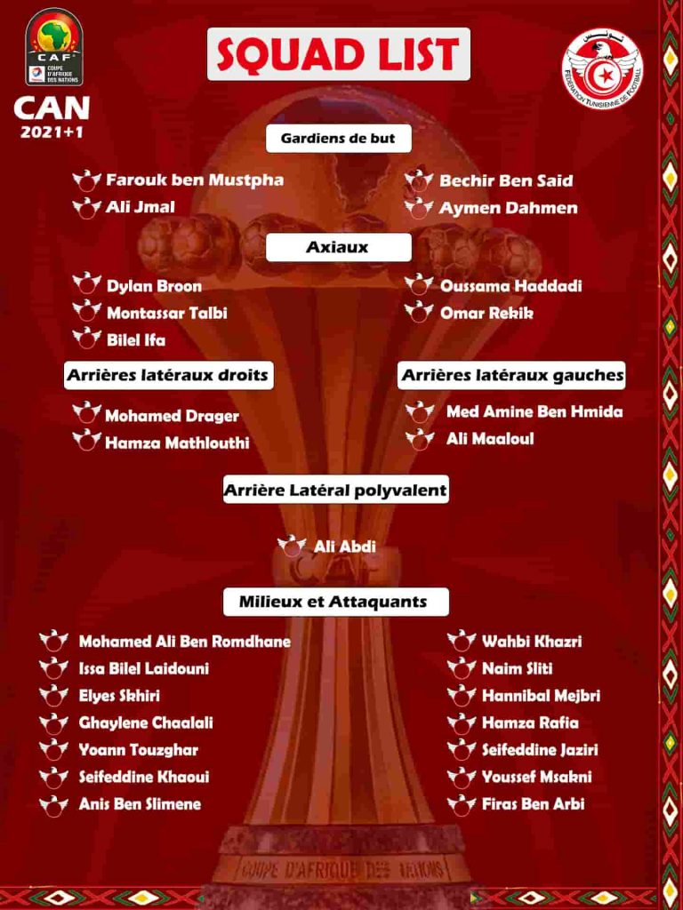 وجاءت قائمة منتخب تونس تواجد علي معلول لاعب الأهلى الذي جدد لفريقه اليوم إلي 2024 وحمزة المثلوثي لاعب الزمالك وزميله سيف الدين الجزيري وتم استبعاد فرجاني ساسي نجم الدحيل بسبب اصابته بفيروس كورونا ويتواجد منتخب تونس في مجموعة تضم مالي وموريتانيا وغامبيا.